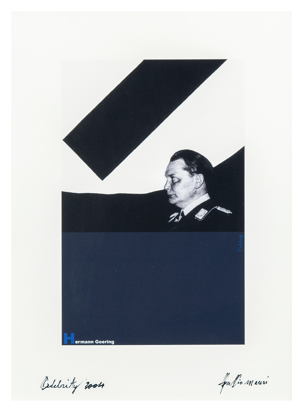 Series of seven graphics titled Celebrity, conceived in 2004 for the Dutch magazine BABY, but never published. Similar to Manipolazione di cultura (inv. 3553) in theme and layout, they follow the same tripartite vertical format: a photograph in the upper portion, a monochrome in the lower portion, and a caption. The photographic images portray high-ranking Nazi apparatchiks: Hermann Goering, Heinrich Himmler, Edda Ciano with Goebbels’ daughters, Eva Braun, Josef Goebbels, Adolf Hitler and Rudolf Hess. The underlying monochrome, of varying dimensions, is midnight blue, almost black; the lower caption conveys the names of the people portrayed in white, with ultramarine blue initial capital letters.