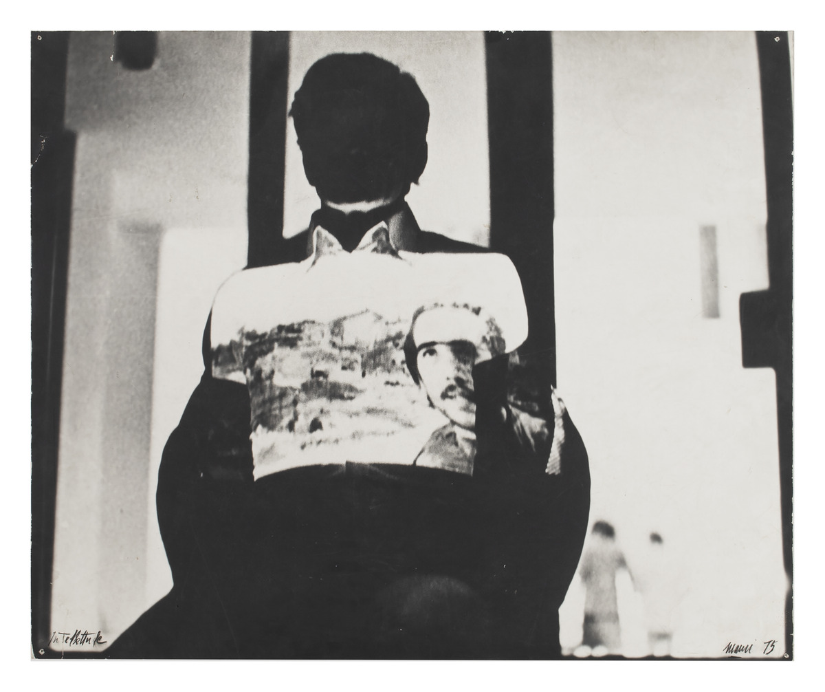 Photographic print of the Intellettuale performance (inv. 985), taken by Antonio Masotti at the Galleria d’Arte Moderna in Bologna in 1975. The image portrays Pier Paolo Pasolini as a black silhouette with his film The Gospel According to Matthew projected onto his chest.