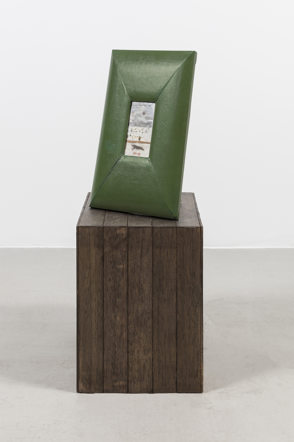 Item consisting of a leather-lined, tabletop photo frame displayed on a wooden base roughly half a metre high. Dominating the composition, the green-leather frame contains a small drawing/collage of a shadow man with a red wax spot in line with his chest, a barely legible scorched inscription, a wooden trough, a tuft of hair and two dates, ‘1952–1958’, written in red, stand out. A brass plate screwed into the rear of the frame gives the title of this work, from the ‘Ebrea’ exhibition-installation (inv. 3476).