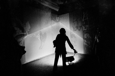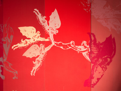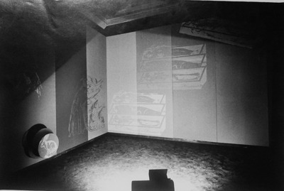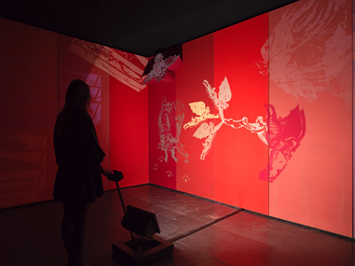 An installation created for the ‘Amore mio’ exhibition at Palazzo Ricci in Montepulciano, which opened on 30 June 1970. Overturning customary organisational practice, sixteen artists ‘self-convened’ through a series of consultations, called on Achille Bonito Oliva to ‘contradict the role of art critic’.1 The artists involved were Carlo Alfano, Getulio Alviani, Mario Ceroli, Gianni Colombo, Gabriele De Vecchi, Luciano Fabro, Jannis Kounellis, Renato Mambor, Gino Marotta, Fabio Mauri, Mario Merz, Mario Nanni, Maurizio Nannucci, Michelangelo Pistoletto, Paolo Scheggi and Cesare Tacchi; Piero Sartogo was in charge of ‘image coordination’. Each artist was given a room in the building to display ‘the matrices of their expressive position’.2 Mauri covered the walls of his assigned space with a series of canvases reprising scenes and details from the Trionfo della morte (Triumph of Death), a fourteenth-century fresco in Pisa’s Camposanto attributed to Andrea di Cione di Arcangelo, known as Orcagna.3 He selected, decontextualised and reproduced damned souls, symbolic figures, devils and skeletons in brightly coloured silkscreens on coloured canvases. Above them, two elements from the same canvas, shaped and turned inside out, show a rabbit and an angel-Lucifer projecting toward the room’s interior. The audience was able to direct a revolving spotlight attached to the floor in the centre at will to cast light on details in the otherwise dark room. Through the contrast between medieval iconography and modern graphic rendering, Mauri identified an ‘expressive stance’ between historical roots and new stylistic approaches, adopting a modus operandi that, elsewhere, the artist would refer to as ‘a present-day use of the past’.4