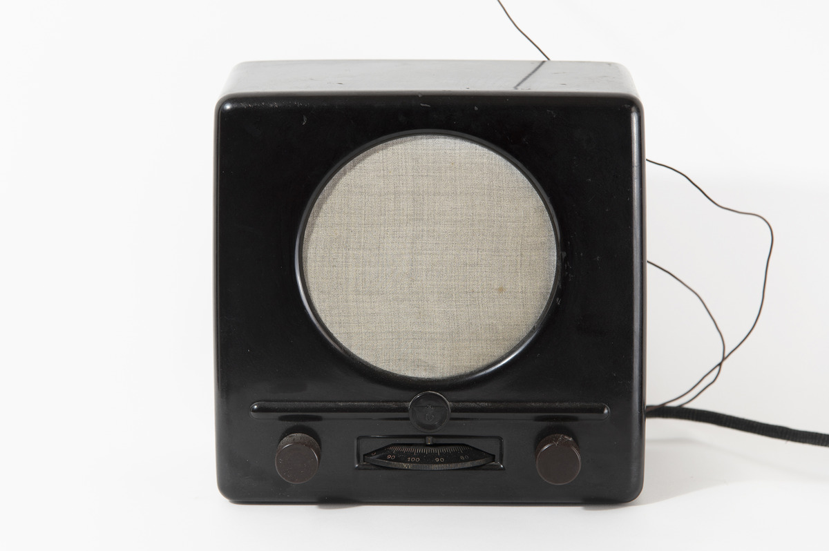 A 1930s German radio, a Volksempfanger DKE38, literally ‘people’s receiver’, a device with a rather limited reception circuit designed to be affordable to the masses. It was displayed at the entrance to the ‘Istantanea di un duca morto’ exhibition-installation (inv. 654), transmitting white noise at varying volumes into the gallery rooms. It is well-known that this radio became a key instrument for Nazi propaganda, so much so that the DKE38 model was ironically nicknamed ‘Goebbels-Schnauze’, Goebbels’ snout.