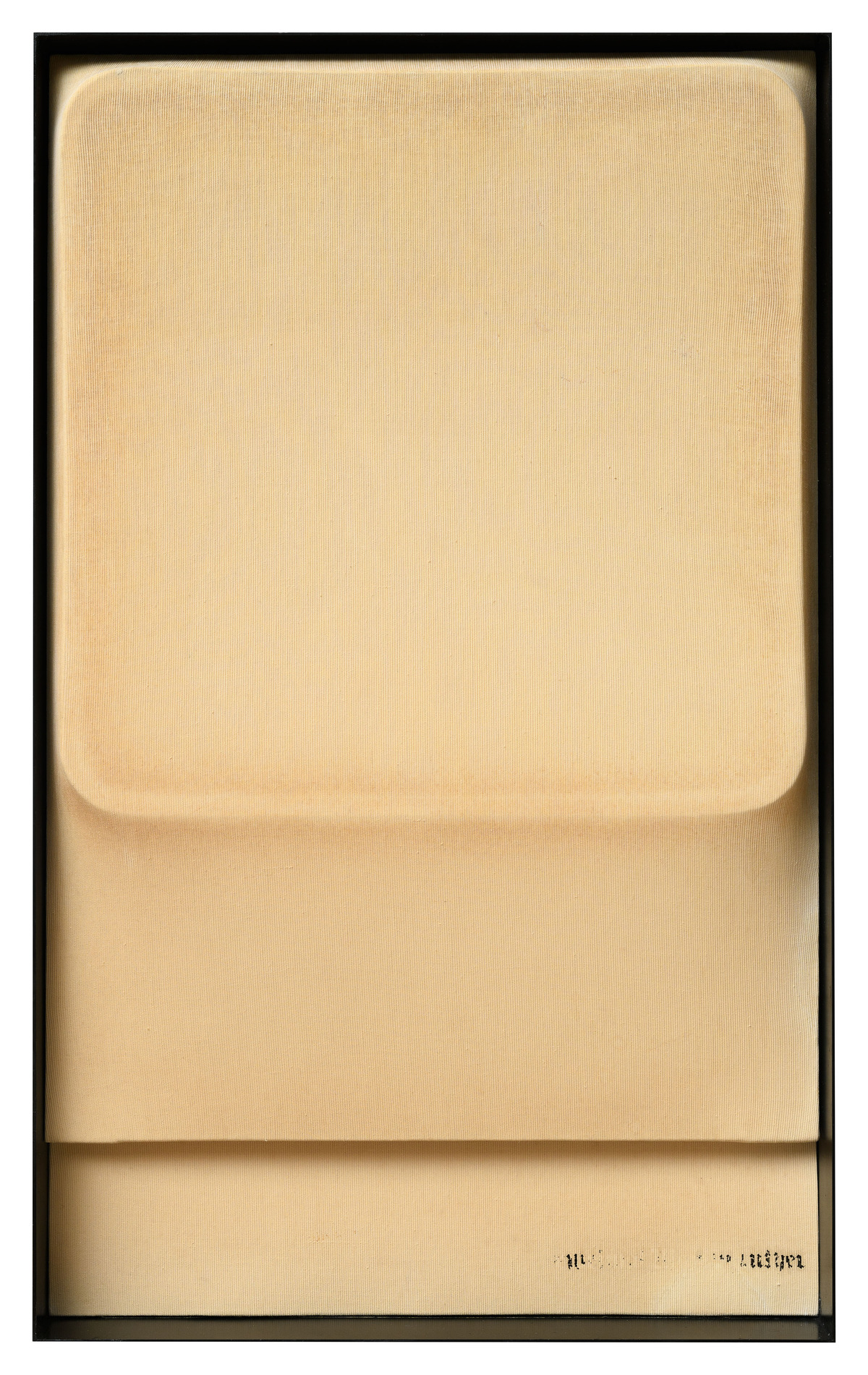 Schermo (Screen) on canvas with a ‘millerighe’ texture, inserted in a box frame with cardboard backing covered in the same fabric. The title of the artwork is displayed in the bottom-right-hand corner of the cardboard with Letraset transfer letters in German Gothic script. Zweimal Martin Luther is one of forty ‘thoughts’ that Mauri presented on forty screens at the ‘Warum ein Gedanke einen Raum verpestet?/Perché un pensiero intossica una stanza?’ exhibition-installation (inv. 700): words that were significant for various reasons, arranged in a scattered order, as if in a stream of consciousness.