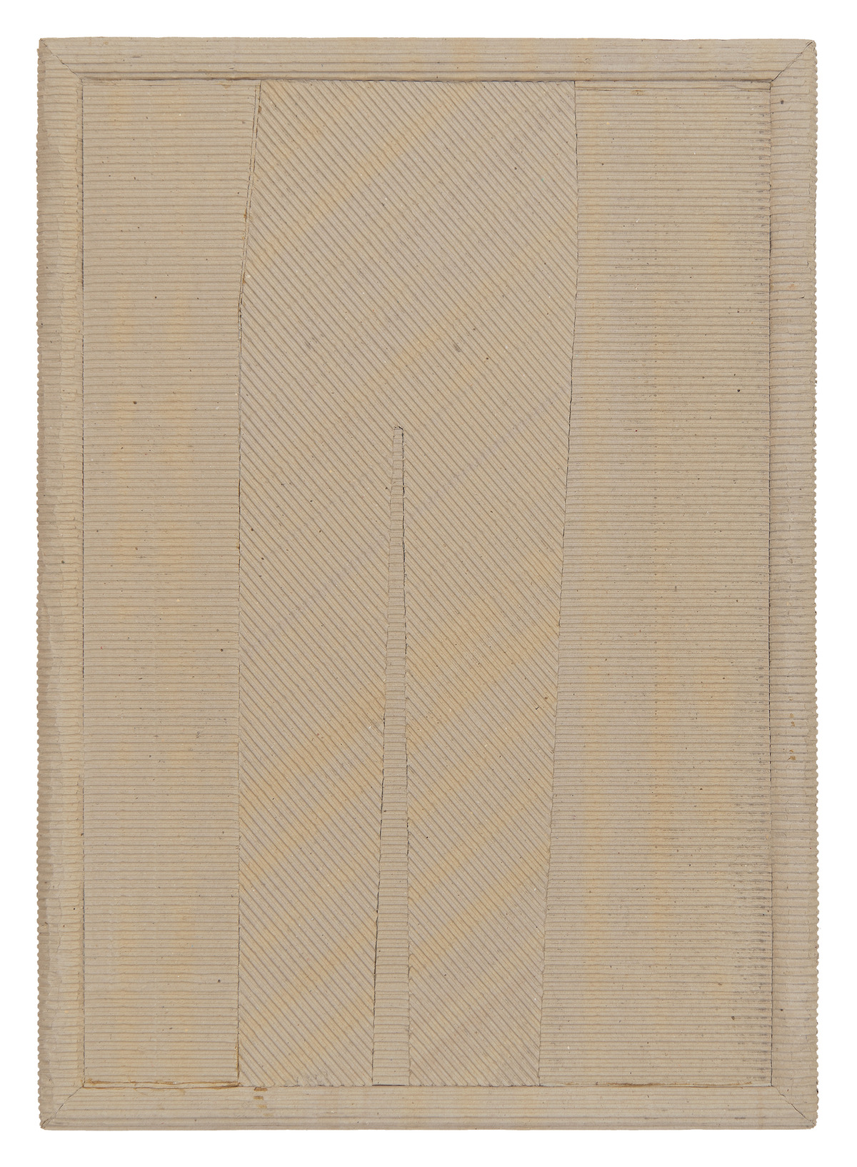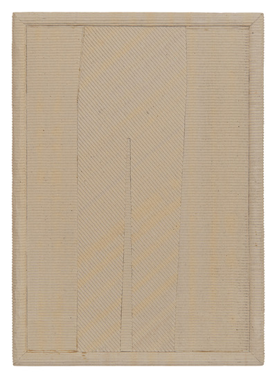Wooden panel with a raised frame, covered in corrugated cardboard. An insert of the same material, its ‘undulations’ rotated 45° compared to the background, forms a silhouette reminiscent of the lower part of a torso in the centre of the picture. The title, Formazione di un pensiero anarchico, references other Mauri works from the 1970s (inv. 223), while the technique refers to a work from that same period, Ritratto dell’anarchico Galli (inv. 427), in which a different orientation of the corrugated cardboard between the figure and the background seems to reflect a tendency toward ‘continuous opposition’,1 something the artist attributed to his anarchic temperament.