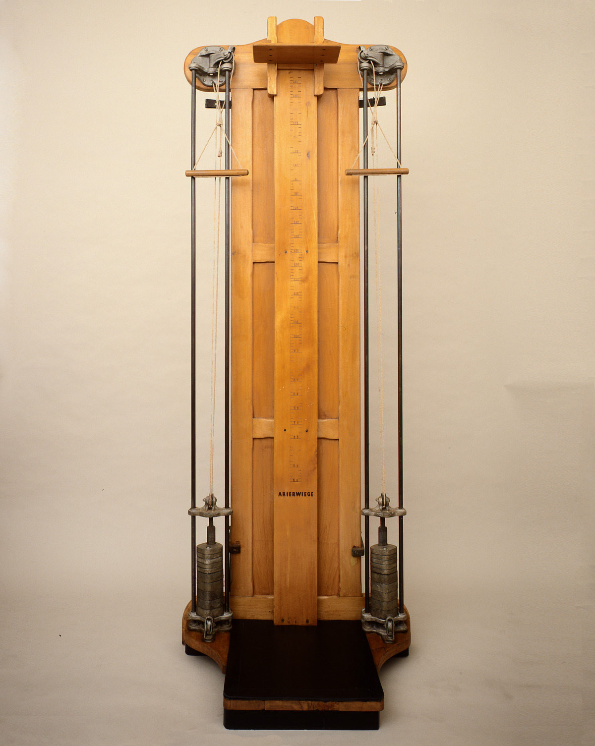MATERIALS: Branding on wooden exercise machine, weights