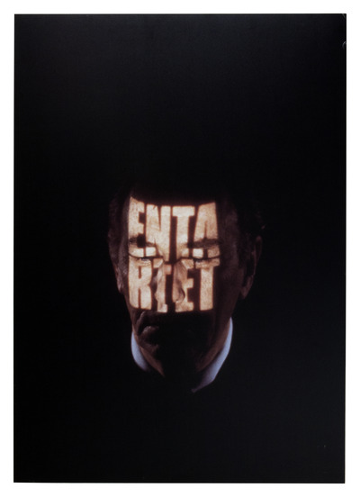 Fotografia della conferenza-performance Ricostruzione della memoria a percezione spenta (inv. 3521) che mostra Mauri nel momento in cui viene proiettata sul suo volto la scritta «Entartete Kunst», ripreso dalla fotografa Elisabetta Catalano. La fotografia è stata prodotta in questo formato dall’artista, che firma l’opera.