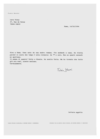 Invitato a partecipare a una mostra sul concetto di tempo, Fabio Mauri invia alla Galerie Lara Vincy di Parigi un’opera in forma di “lettera oggetto”: «Vivo a Roma. Sono nato da una madre romana. Sto andando a casa. Ho fretta perché il conto del tempo è alla rovescia: da ∝ a zero. Non so quanti secondi mi spettano. / Il senso di questo? Tutto e Niente. Ho scelto Tutto. Ma ho trovato che tutto già era così, niente escluso. / Cordialmente. / Fabio Mauri».
