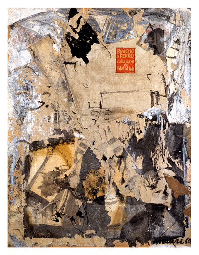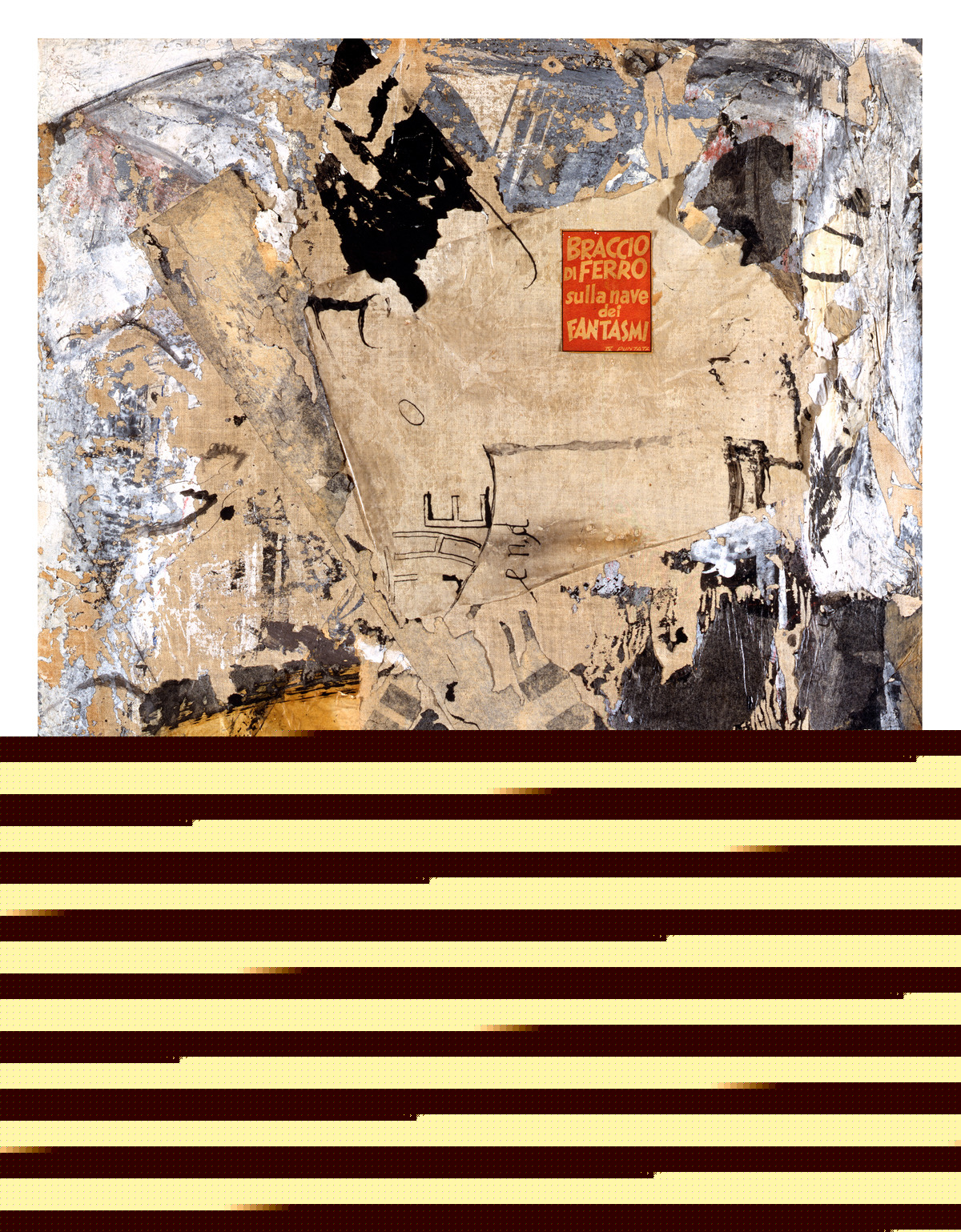 Pittura a tecnica mista su tela con inserti a collage tra cui si distingue il titolo su fondo rosso del fumetto “Braccio di Ferro sulla nave dei fantasmi” e interventi a inchiostro nero come la scritta centrale «THE end».