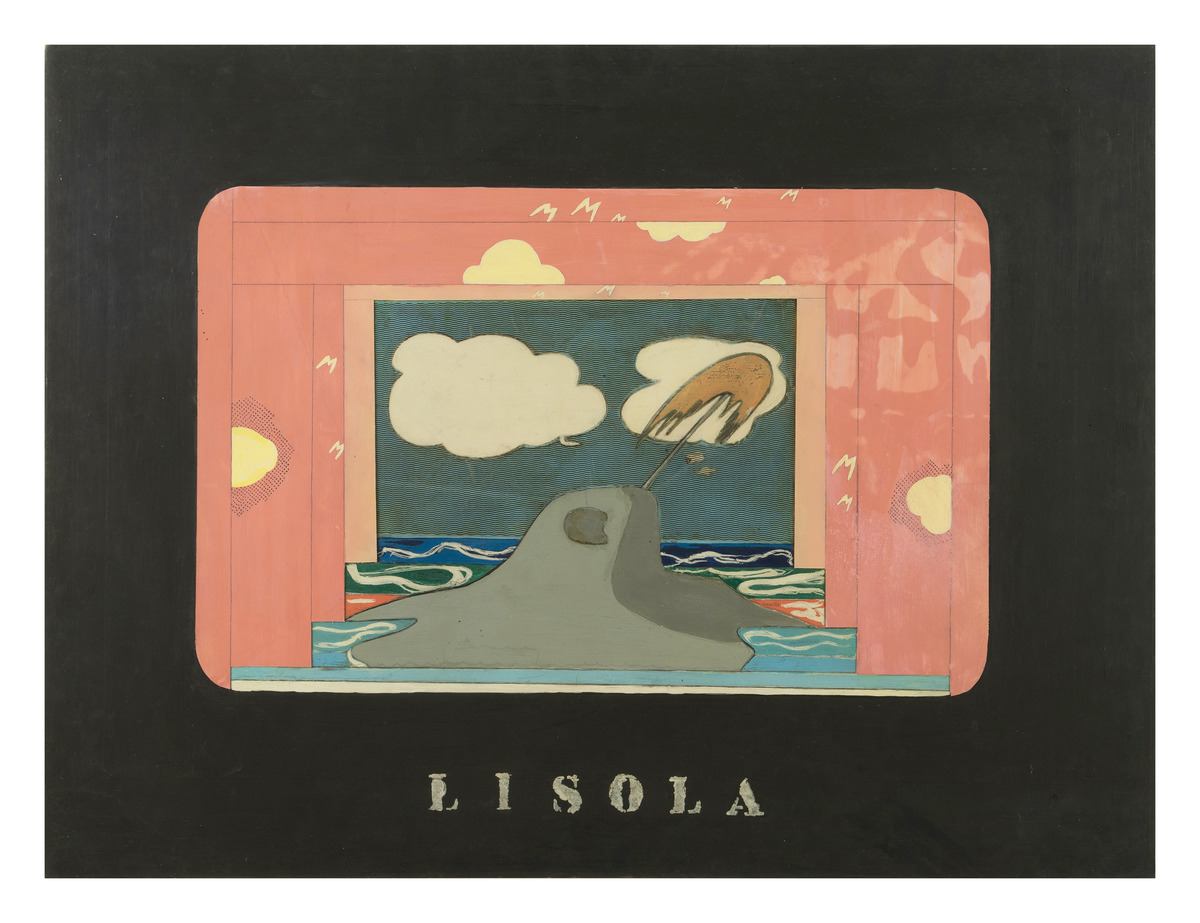 Una cornice nera dipinta a tempera lungo i bordi del foglio, del tutto simile a quella degli schermi degli anni sessanta, inquadra il bozzetto della scenografia de L’Isola (inv. 3438), commedia teatrale scritta, disegnata e diretta da Fabio Mauri, di cui si riporta il titolo sul margine in basso. La scenografia è qui costruita per livelli sovrapposti dipinti con tecniche e materiali tipici del fumetto: il cielo-fondale azzurro è ombreggiato da un pattern prestampato su acetato trasparente; intorno alle nuvole gialle dei puntini a matita simulano i caratteristici retini trasferibili; il tronco della palma è in carta argentata; quinte teatrali rosse disegnate su carta e montate su acetato chiudono la composizione1.