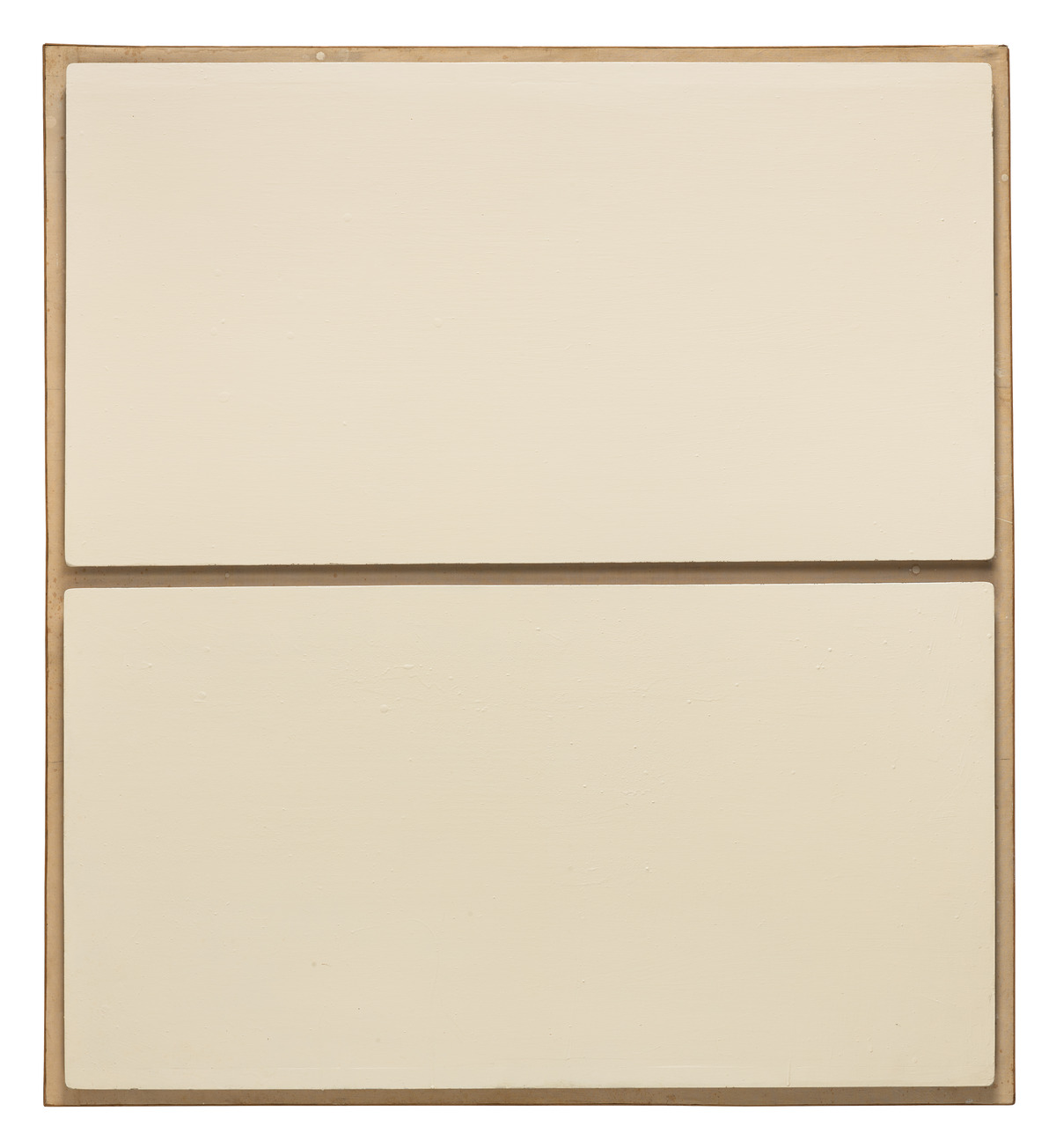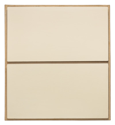Due tavole-schermo bianche e monocrome sono montate, una sopra l’altra, su un telaio in legno naturale. L’opera, intitolata Schermi in legni bianchi1, è quasi sempre stata esposta insieme allo Schermo in legno nero (inv. 179), di identico formato ma costituito da un’unica tavola monocroma.