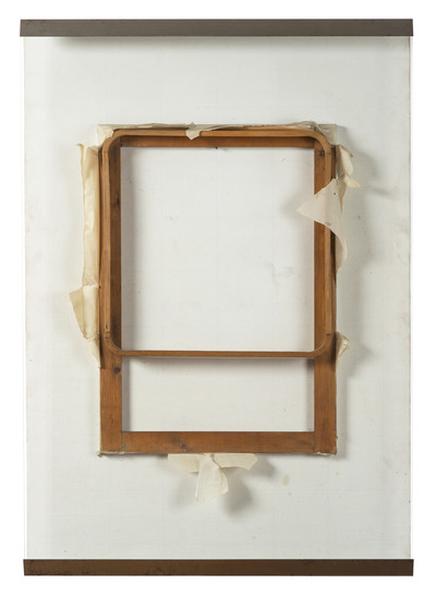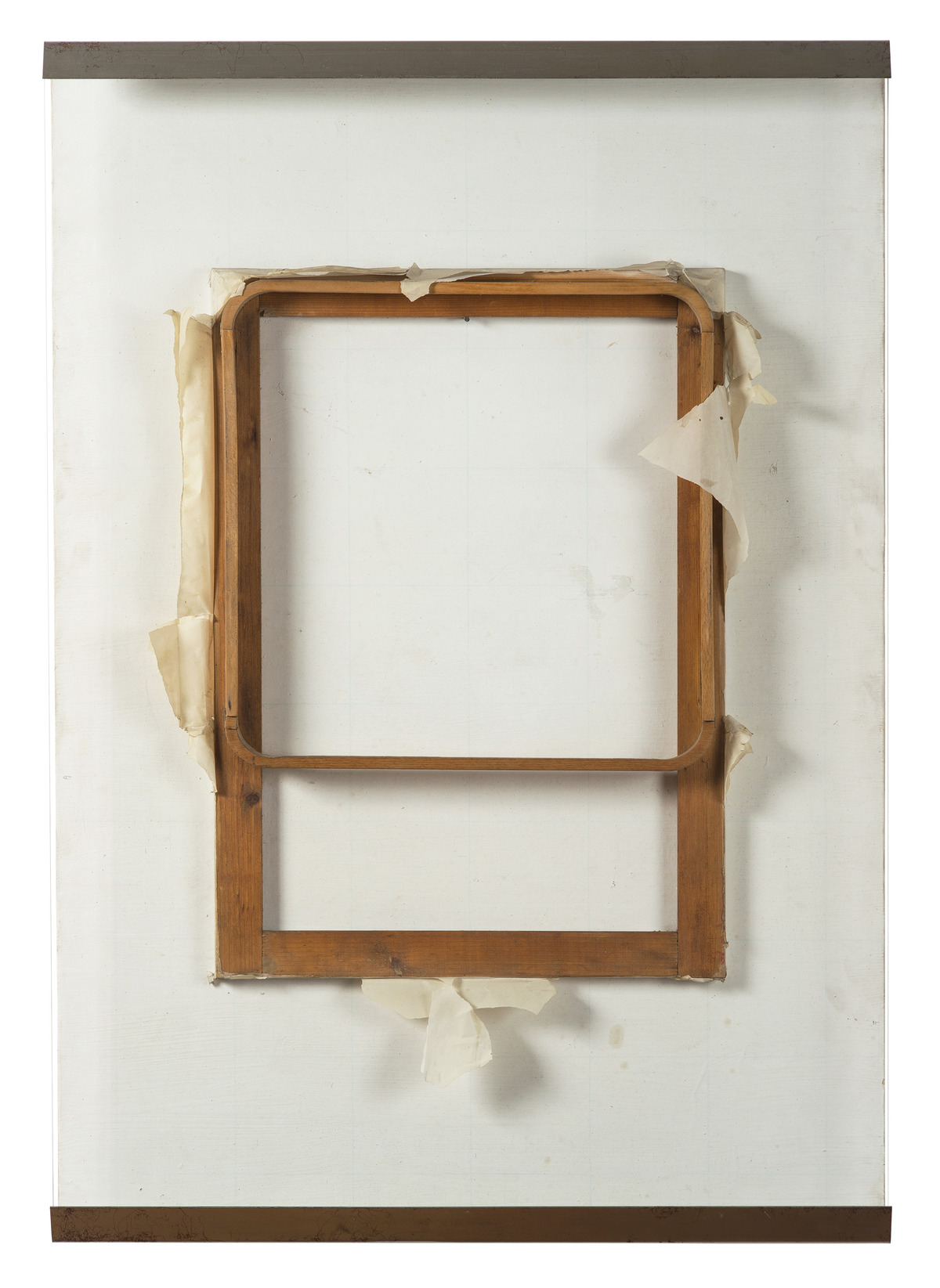 Quadro composto da uno schermo in carta di “prima generazione”, rotto, montato al centro di una tavola monocroma bianca inquadrata da una cornice aperta ai lati. L’opera danneggiata, anziché essere restaurata, viene qui esposta nella sua nudità di oggetto, ri-presentata nella sua fragilità materiale soggetta al passare del Tempo e della Storia.