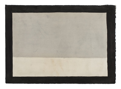 Schermo-disegno caratterizzato da una cornice nera dipinta lungo i bordi del foglio che inquadra un dipinto astratto, suddiviso trasversalmente in due parti di colore diverso.