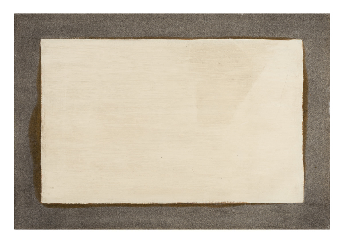 Schermo-disegno caratterizzato da una cornice grigia dipinta lungo i bordi del foglio che definisce un “campo di proiezione” colorato di bianco, simile a quello dei primi schermi-disegni del 1957 (cfr. inv. 186).