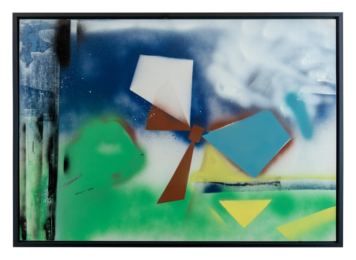 Opera su carta composta da pittogrammi e figure dipinte a spruzzo attraverso mascherature con smalti oleo-sintetici, che si ripetono liberamente sul foglio, contro uno sfondo dai brillanti colori industriali sfumati a spray. Il disegno fa parte di una serie in cui ricorrono le immagini stilizzate di un “cinema a luce solida” (cfr. inv. 210) e di una palma che ricorda la scenografia de L’Isola (inv. 3438), oltre alle scritte «THE END» e «DIRECTOR» (cfr. inv. 206) che, nella ripetizione seriale, a volte assumono l’aspetto di loghi, mentre in altri casi si smaterializzano in forme astratte, perdendo ogni riferimento alle opere cui si riferiscono.
