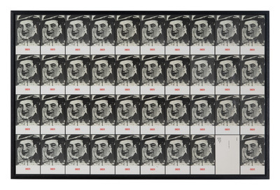 Quaranta cartoline, formato 14,8 × 9,2 cm, disegnate e autoprodotte dall’artista, sono incollate su di un cartoncino nero in quattro file da dieci. La composizione gioca sulla ripetizione seriale che moltiplica il volto serigrafato di Al Capone e la scritta-brand Gangster (cfr. inv. 265). La penultima cartolina in basso a destra, spezza il ritmo della composizione mostrando il retro che, ironicamente, riporta scritto: «Gangster / Any way you want it / Fabio Mauri / Without Gallery / Rome-Italy / 1974».