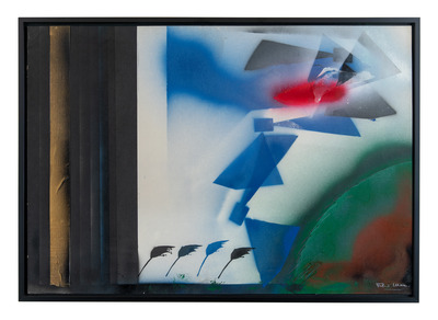 Opera su carta composta da figure dipinte a spruzzo con smalti oleosintetici attraverso mascherature che si ripetono liberamente sul foglio, su sfondi spray sfumati e dai brillanti colori industriali.