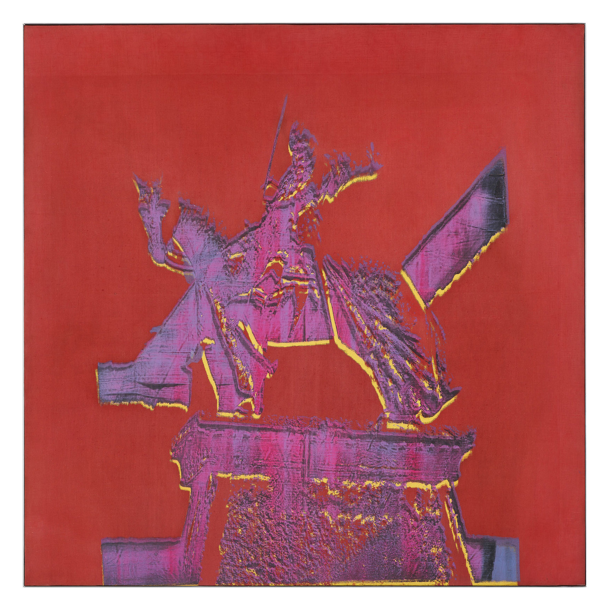 Serigrafia su tela dedicata al monumento equestre di Cangrande della Scala a Verona, risalente alla prima metà del XIV secolo. Come in Amore mio (inv. 3427), Fabio Mauri declina l’immagine di un capolavoro dell’arte italiana con una tecnica grafica contemporanea che, con i suoi colori e la sintesi grafica, si riferisce alla Pop Art americana rivendicando alcune sostanziali differenze: «Gli italiani ricercavano una definizione figurativa della Società dei Consumi che in quel periodo si stava delineando, ma a differenza dell’America gli artisti italiani avevano sotto gli occhi l’imperativo dell’arte classica dovuta ai monumenti e ai musei dell’arte mediterranea e rinascimentale. In tale senso la pop italiana non è stata Pop»1.
