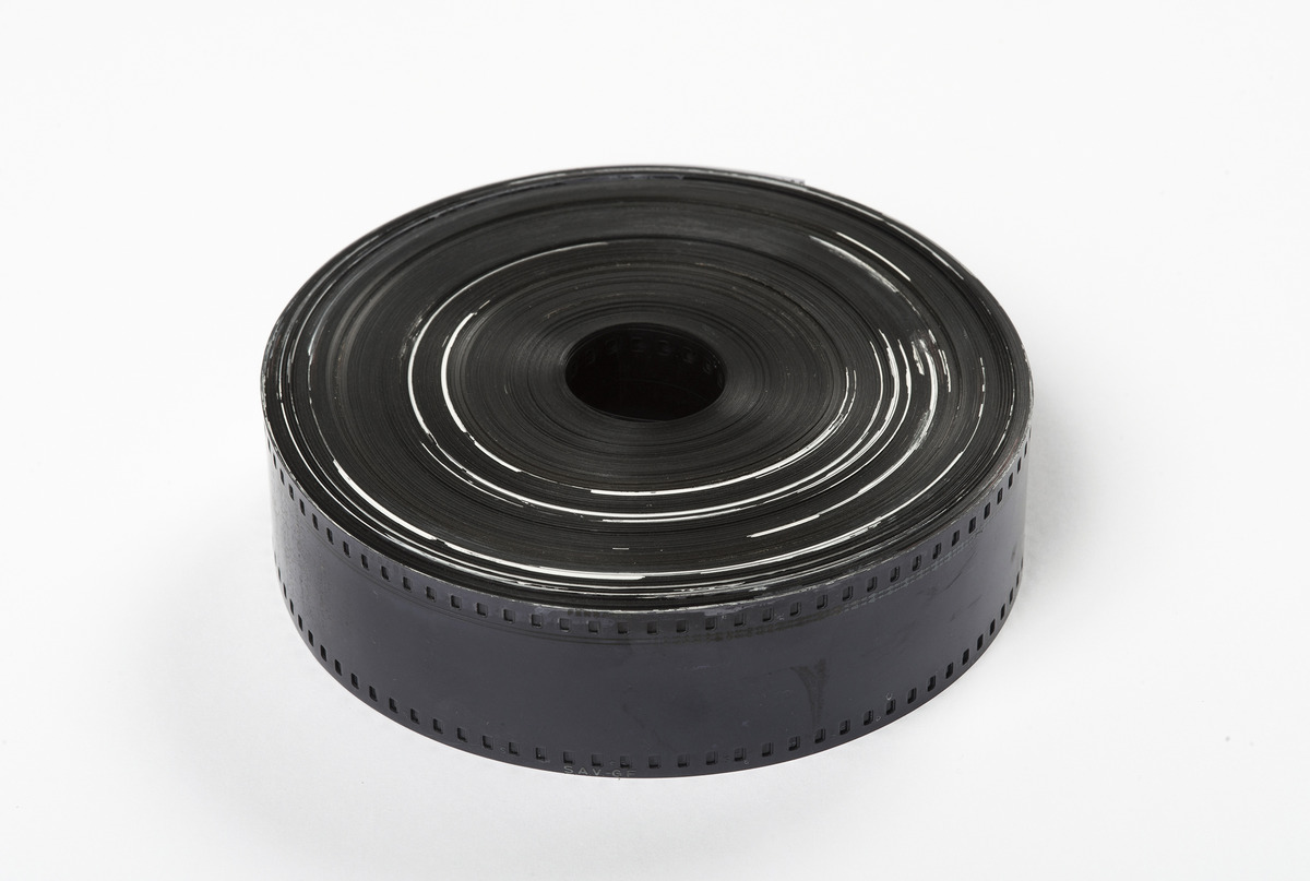 Pellicola cinematografica avvolta in una bobina il cui perimetro esterno si presenta tinto di grigio. L’aggiunta di una “coda” di pellicola colorata, ottenuta in laboratorio per imbibizione, serviva ai proiezionisti per distinguere a colpo d’occhio l’inizio dalla fine del film: un dialogo tra pittura e cinema intrinseco agli strumenti tecnici della sua proiezione (cfr. inv. 20, 22, 23).