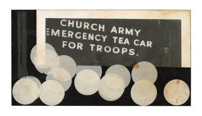 Un cartoncino nero patinato riporta in alto a destra il ritaglio di una stampa che inquadra la scritta “Church army emergency tea car for troops”. Il particolare è tratto da una delle centodue fotografie che formano l’installazione Linguaggio è guerra (cfr. inv. 307) nella cui parte bassa si vedono i volontari della chiesa in abiti civili che versano tazze di te a dei soldati in divisa.