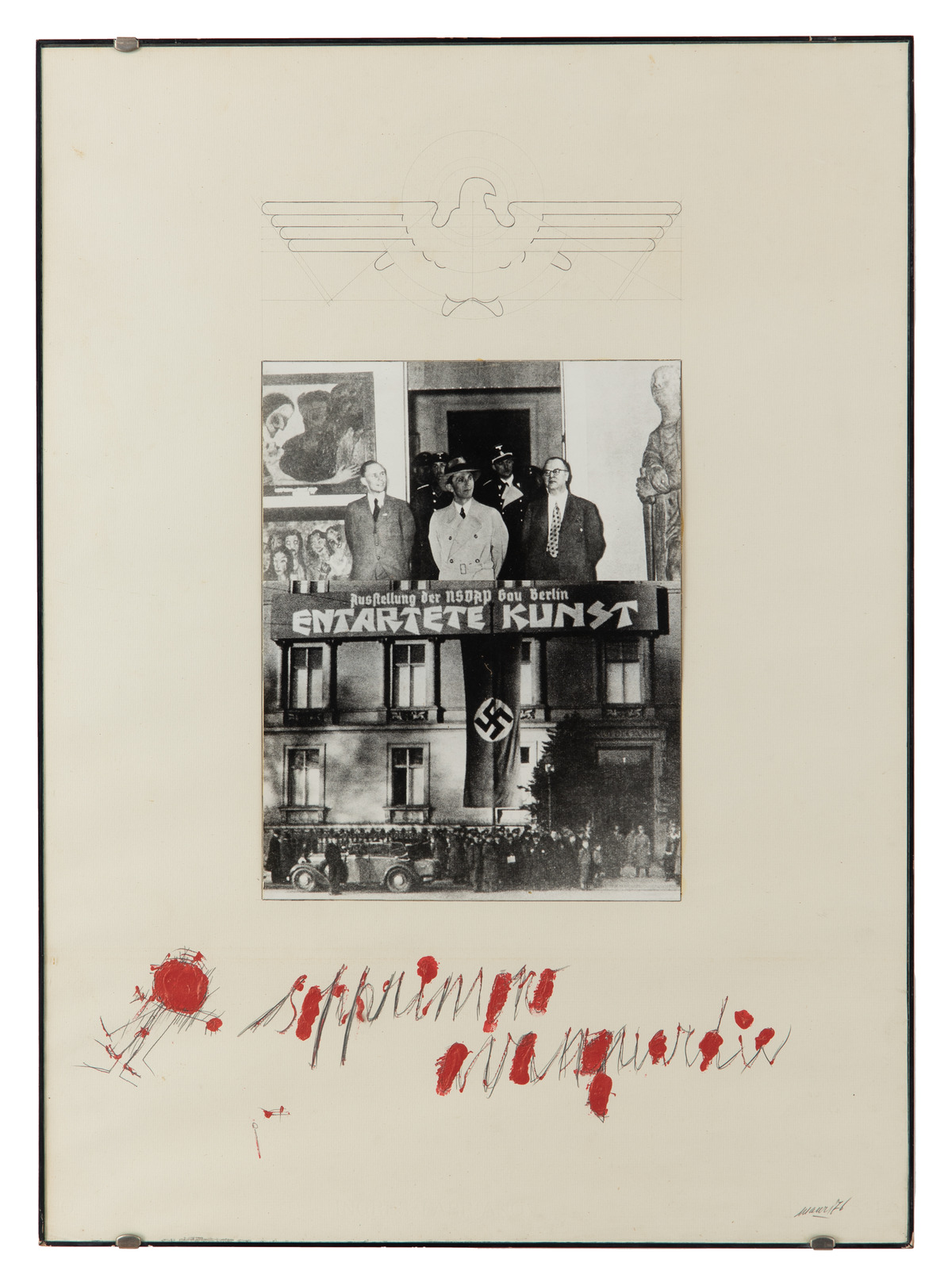 Due fotografie giustapposte in verticale mostrano rispettivamente la folla in attesa di entrare all’inaugurazione della mostra Entartete Kunst (Haus der Kunst, Berlino 26 febbraio 1938) e il ministro tedesco Joseph Goebbels, accompagnato dal commissario dell’esposizione Hartmut Pistauer (alla sua sinistra, con gli occhiali), in visita ufficiale alla stessa mostra, tra le opere degli artisti Gerhard Marcks ed Emil Nolde. Sopra le immagini, colme di simboli e grafiche di propaganda, un disegno a matita ricostruisce il design geometrico dell’aquila nazista, emblema del partito NSDAP (National Sozialistische Deutsche Arbeiter Partei) promotore della mostra. Sul margine inferiore, la scritta a mano libera «sopprimono avanguardie», affiancata da un disegno stilizzato e da macchie di vernice rossa, riprende uno dei titoli di Manipolazione di cultura (cfr. inv. 3502).