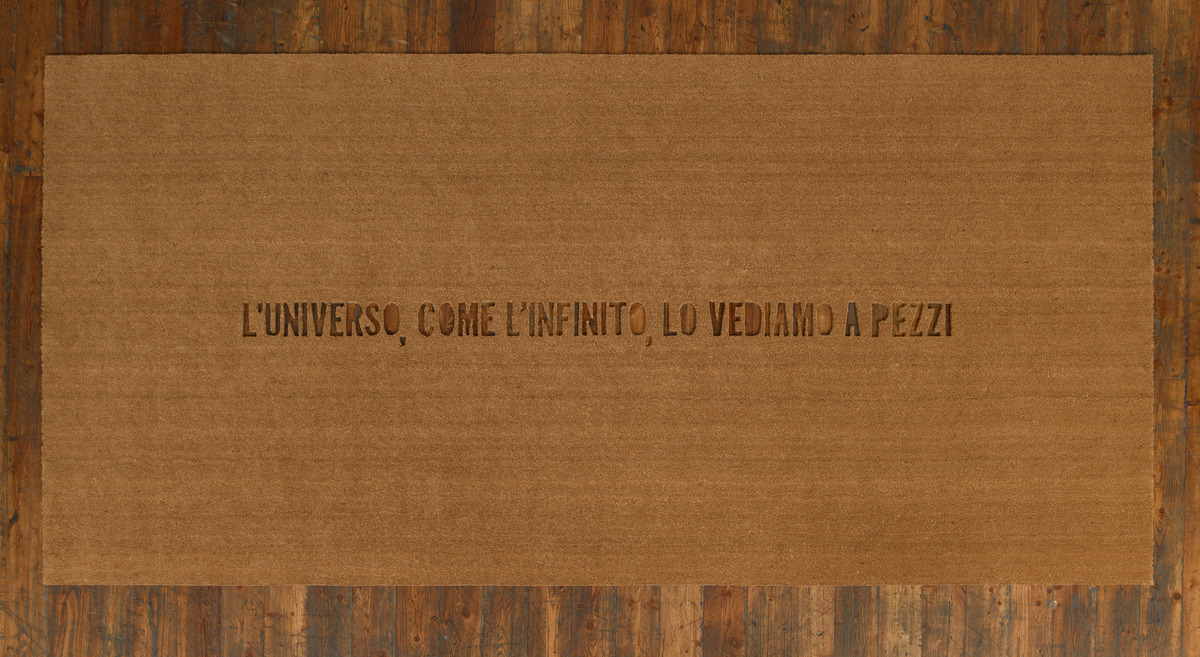 Cinque zerbini di grandi dimensioni riportano intagliate altrettante frasi1, pensieri in forma di opera, leggibili in negativo grazie al contrasto col pavimento. Realizzati da Fabio Mauri a poche settimane dalla morte, gli zerbini portano incise cinque definitive dichiarazioni sull’arte, sull’artista, sull’universo: il pubblico è invitato a camminarci sopra, a consumarli, a farli sparire.