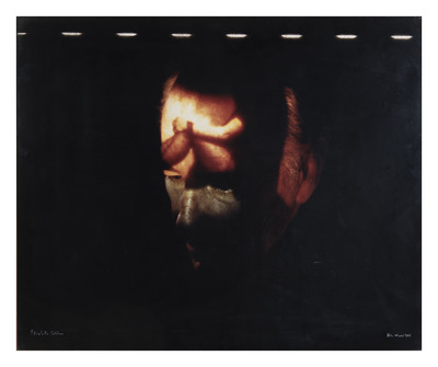 Fotografia della conferenza-performance Ricostruzione della memoria a percezione spenta (inv. 3521) che mostra Mauri nel momento in cui viene proiettato sul suo volto un video realizzato dall’artista stesso per la performance. La fotografia è stata prodotta in questo formato dall’artista, che firma l’opera insieme alla fotografa Elisabetta Catalano.