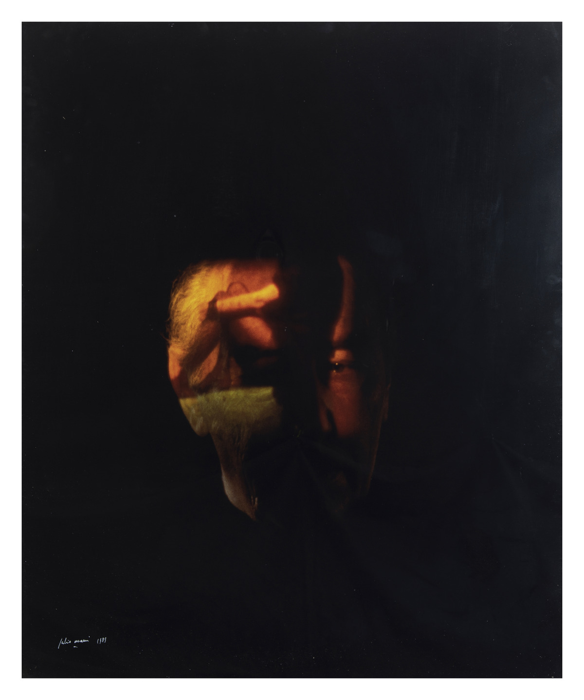 Fotografia della conferenza-performance Ricostruzione della memoria a percezione spenta (inv. 3521), realizzata dalla fotografa Elisabetta Catalano che riprende Mauri mentre viene proiettato sul suo volto un video realizzato dall’artista stesso per la performance. La fotografia è stata prodotta in questo formato dall’artista che firma l’opera.