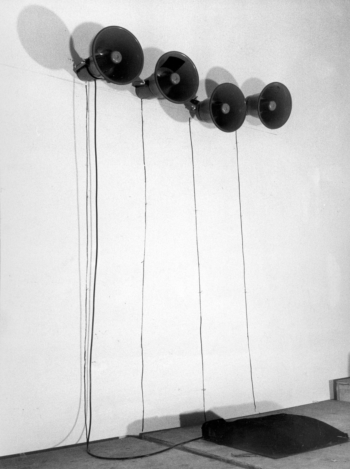 Quattro altoparlanti appesi al muro e collegati a un registratore a cassetta trasmettono a ciclo continuo l’audio della performance Che cosa è il fascismo: Festa in onore del generale Ernst Von Hussel di passaggio per Roma (inv. 3474). L’installazione sonora, inizialmente parte dell’omonima installazione per la X Quadriennale (inv. 3479), fu esposta insieme a una documentazione fotografica della performance al Civic Center Museum di Philadelphia nel 1973 e con solo due diffusori audio alla Galleria Duemila di Bologna nel 1974.