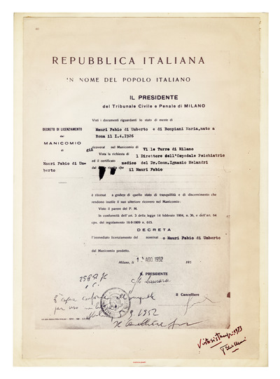 Un cartoncino bianco formato A3 è avvolto in una carta semitrasparente sulla quale è incollata l’ultima pagina del libro d’artista Der Politische Ventilator (inv. 205). La stampa riporta il decreto di dimissione dal manicomio di «Mauri Fabio di Umberto» in cui il presidente del Tribunale Civile e Penale di Milano congeda l’artista dall’ospedale psichiatrico di Ville Turro di Milano in quanto «ritornato a godere di quello stato di tranquillità e discernimento che rendono inutile il suo ulteriore ricovero nel manicomio». Nell’angolo in basso a destra del foglio, Mauri controfirma il documento apponendo un «visto si stampi» come si usa fare sulle prove di stampa tipografiche. La stessa formula è riportata come titolo dell’opera in calce al foglio, al centro, con lettere trasferibili rosse.