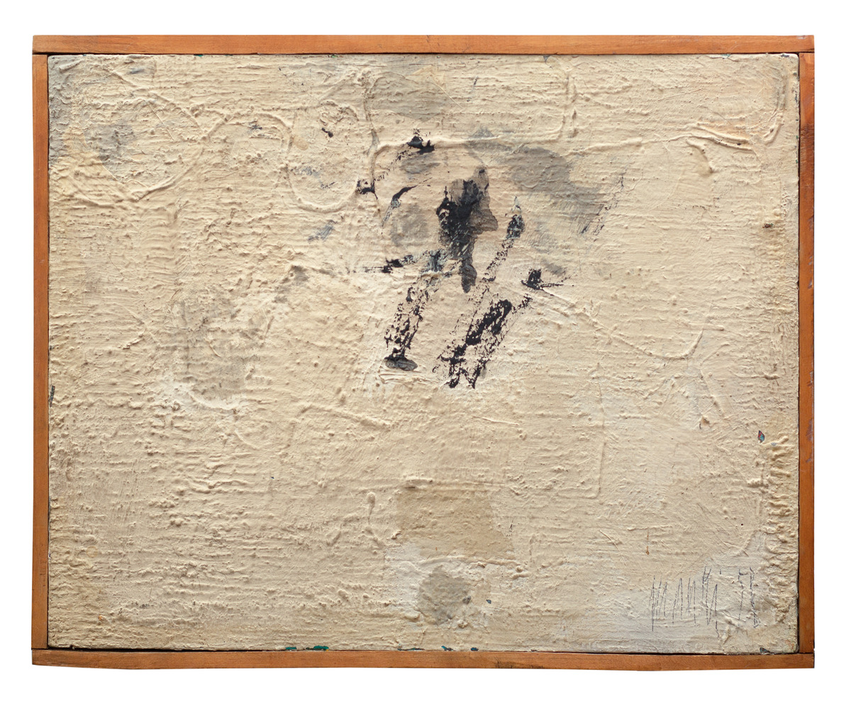 Dipinto su tela realizzato nello stesso periodo in cui Mauri lavora ai primi schermi. La figuratività espressionista e la ricchezza cromatica delle prime opere lasciano qui spazio a una sperimentazione di natura astratta, tendente al monocromo, incentrata sulla materia e sul segno.