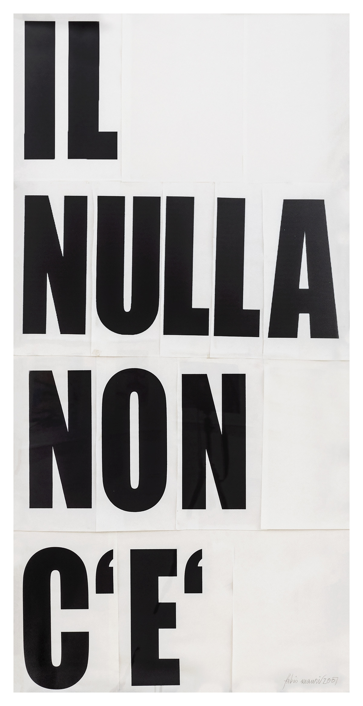 Delle lettere maiuscole, stampate ognuna su un foglio di carta, sono giustapposte tra loro a formare la scritta «IL NULLA NON C’È». L’opera fu esposta durante il Festival della Filosofia di Roma nella mostra personale L’universo d’uso.
