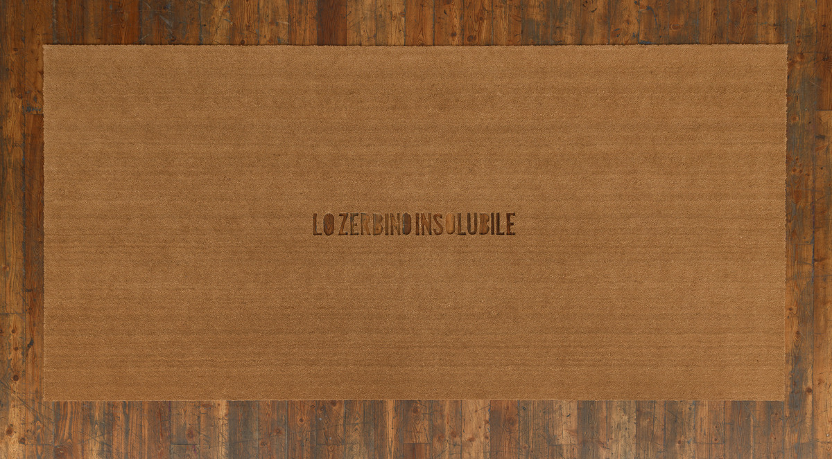 Al centro di un tappeto in fibra di cocco, zerbino di grandi dimensioni, è intagliata la scritta «Lo zerbino insolubile» leggibile in negativo grazie al contrasto con il pavimento. Dopo Zerbino ariano (inv. 605), in cui la frase era ottenuta bruciando la fibra, e L’ospite armeno (cfr. 873), dove la scritta forava solo uno dei due tappeti sovrapposti, con lo Zerbino insolubile si arriva a una sintesi formale per cui «la frase, che rende significante il tappeto, non è più una scritta sovrapposta, ma forma e contenuto sono inseparabili»1. Verrebbe da dire, per l’appunto, “insolubili”, nella doppia accezione di enigmatico e inscindibile: quasi un punto d’arrivo, se è vero che, come scrive Laura Cherubini, «Gli zerbini sono in fondo l’ultima possibile metamorfosi dello schermo»2.