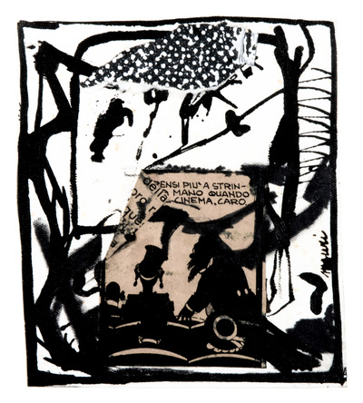 Serie di tre disegni su carta in cui, con pennellate di sapore gestuale, Fabio Mauri rappresenta l’interno di un cinema inserendovi vignette tratte dal fumetto americano Bringing up Father, qui nella sua versione italiana. Nei brani scelti, i personaggi Arcibaldo e Petronilla si trovano al cinema e sono disegnati di spalle come silohuette nere, in controluce rispetto allo schermo.