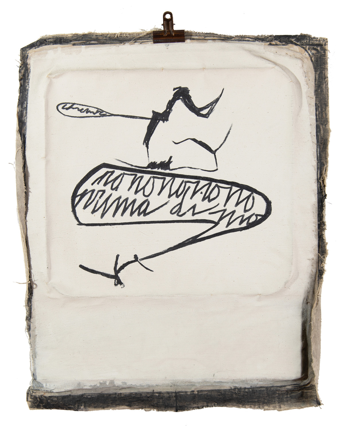 Su una tela bianca, montata in precedenza su un telaio aggettante di cui conserva la forma, Mauri disegna un fumetto difficilmente decifrabile, in cui si distingue solo la frase «no no no no no prima di no», riportata nel balloon centrale. Similmente ad altre opere dello stesso periodo, il contenuto del quadro è oscurato da una calligrafia volutamente ostica, da una sintesi ermetica del segno, da parole e cancellature di vario genere che, anziché affermare, negano, mettendo in primo piano il medium – fumetto o schermo – e il suo linguaggio.