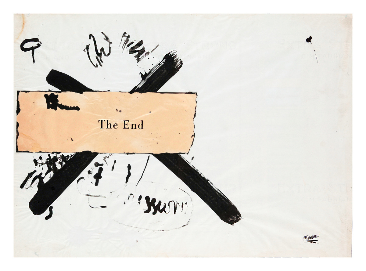 Su un foglio di carta Fabriano "Extra Strong", segni e termini non perfettamente intelligibili – si intuisce qualche lettera, un «the end» sopra la croce e la scritta «nessuno» cerchiata – sono coperti da una «X» dipinta a pennello. Parole appena percepite e cancellate, di segno negativo, censurate ulteriormente da una striscia di carta che copre la croce e ribadisce, con lettere trasferibili nere, «The End».