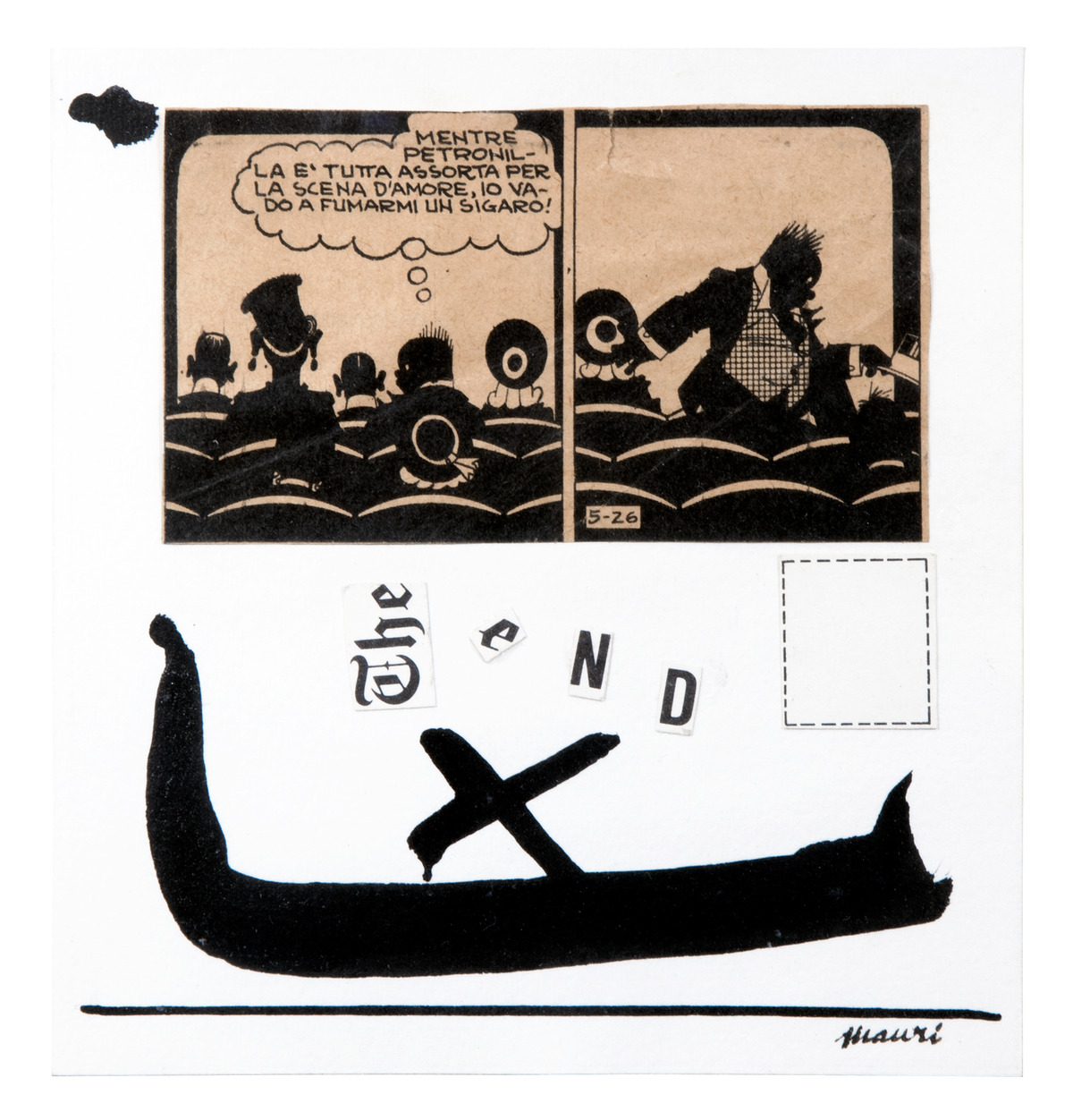 Serie di tre disegni su carta in cui, con pennellate di sapore gestuale, Fabio Mauri rappresenta l’interno di un cinema inserendovi vignette tratte dal fumetto americano Bringing up Father, qui nella sua versione italiana. Nei brani scelti, i personaggi Arcibaldo e Petronilla si trovano al cinema e sono disegnati di spalle come silohuette nere, in controluce rispetto allo schermo.