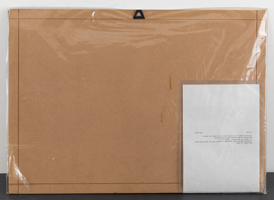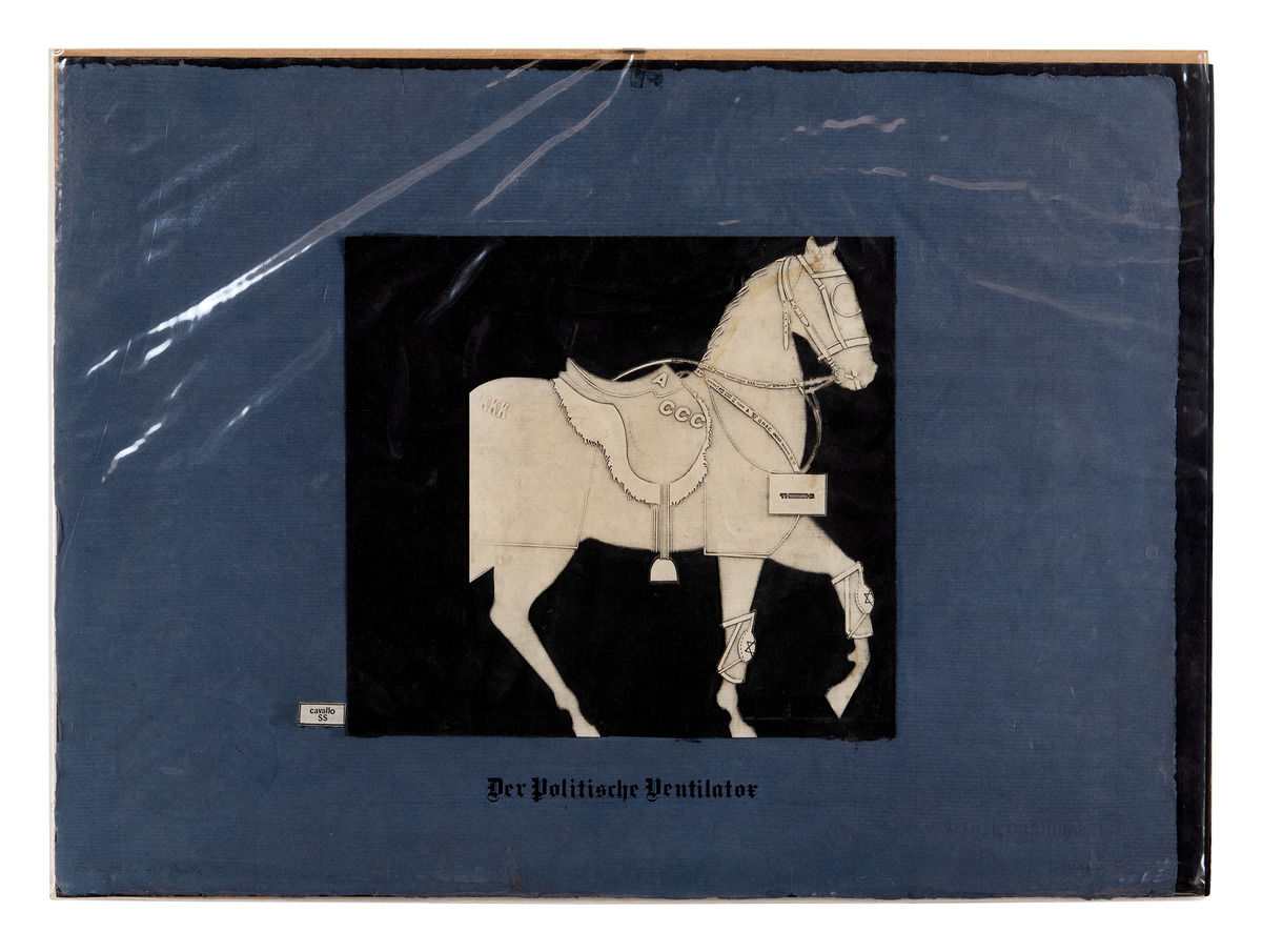 Il disegno della scultura Finimenti in pelle ebrea. Alta scuola militare Oberklandertan – Wien (1971, inv. 311), intitolato Cavallo SS (1971, inv. 3247), è fotocopiato, scontornato e incollato su un fondo nero montato al centro di un cartoncino grigio-blu. Il cavallo è privo della parte posteriore: senza zampa né coda, sembra emergere dall’oscurità come in un sogno, o un incubo, come specifica Mauri al verso della cornice. Sul passepartout colorato, un’etichetta bianca a sinistra riporta il titolo Cavallo SS, mentre più in basso, al centro, la scritta «Der Politische Ventilator», in carattere gotico-tedesco, cita l’omonimo libro di Mauri (1973, inv. 205) che raccoglie opere realizzate tra il 1970 e il 1973. Questo collage, incorniciato a giorno e inserito dentro una busta di plastica trasparente, fu esposto nel 1995 alla mostra Trasparenze. Il Sogno del Cavallo.