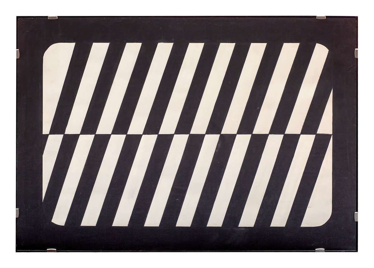 Schermo-disegno caratterizzato da una fascia nera dipinta lungo i bordi del foglio che inquadra un rettangolo dagli angoli arrotondati contenente un motivo geometrico in bianco e nero simile a un’interferenza del segnale televisivo.