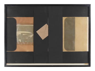 Between 1970 and 1972, Mauri made a series of horizontal-format collages based on a layout characterised by two black bands along the top and bottom edges, with bands transversing the composition through windows reminiscent of movie film frames. Many works in this series employ opal transparent paper to screen the underlying collage, plus side bands with rounded corners similar to ‘barn doors’ on spotlights. As specified in the titles, the collages refer to historical and private events: Bombardamento di Bologna, Affondamento dell’U.BOOT, Scomparsa di Pontecorvo da Bologna, Vita di Lulu de la Falaise, and Stanza dei conti (inv. 201, 206, 207, 243, 1127, 1132).