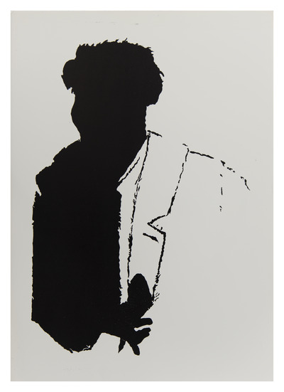 Linocut print on paper, Il bene e il male parlano la stessa lingua reproduces a juvenile drawing executed by Adolf Hitler: a portrait of one of his teachers. Unlike similar works (inv. 341 and inv. 941), in this version the man’s entire rightside and head are covered in a swathe of black, censoring part of his body, face, and the ice cream. Neither signed nor numbered, ten versions of the artwork, originating from the artist’s studio, are known.