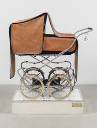 English-style baby carriage with a leather cover placed on a wood, iron and glass base, bearing a brass plaque inscribed with the work’s title. The space between the four wheels features a black canvas at the centre, on which the words ‘THE END’ stand out in white. Hanging from the pushbar is a pocket watch bearing an effigy of Benito Mussolini;1 the same detail appears in the photograph of the invitation to the ‘Ebrea’ exhibition at Galleria La Salita in Rome in 1971. The work was part of the ‘Ebrea’ exhibition-installation (inv. 3476) that rendered the dystopia of a Nazi-ruled world in which, reduced to mere organic matter, racialised bodies were commonly used to make furniture and objects.