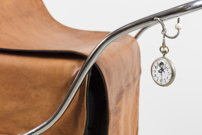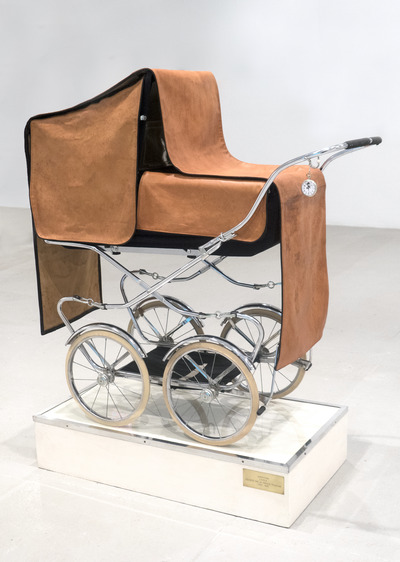 MATERIALS: English-style baby carriage, leather, watch; base in wood, iron and glass; brass plate