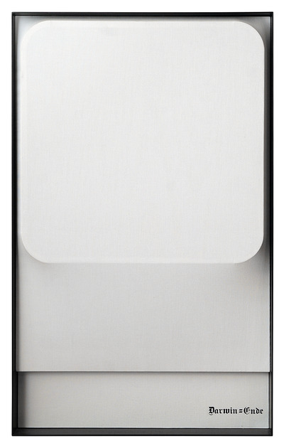 Schermo (Screen) on canvas with a ‘millerighe’ texture, inserted in a box frame with cardboard backing covered in the same fabric. The title of the artwork is displayed in the bottom-right-hand corner of the cardboard with Letraset transfer letters in German Gothic script. Darwin = Ende is one of forty ‘thoughts’ that Mauri presented on forty screens at the ‘Warum ein Gedanke einen Raum verpestet?/Perché un pensiero intossica una stanza?’ exhibition-installation (inv. 700): words that were significant for various reasons, arranged in a scattered order, as if in a stream of consciousness.