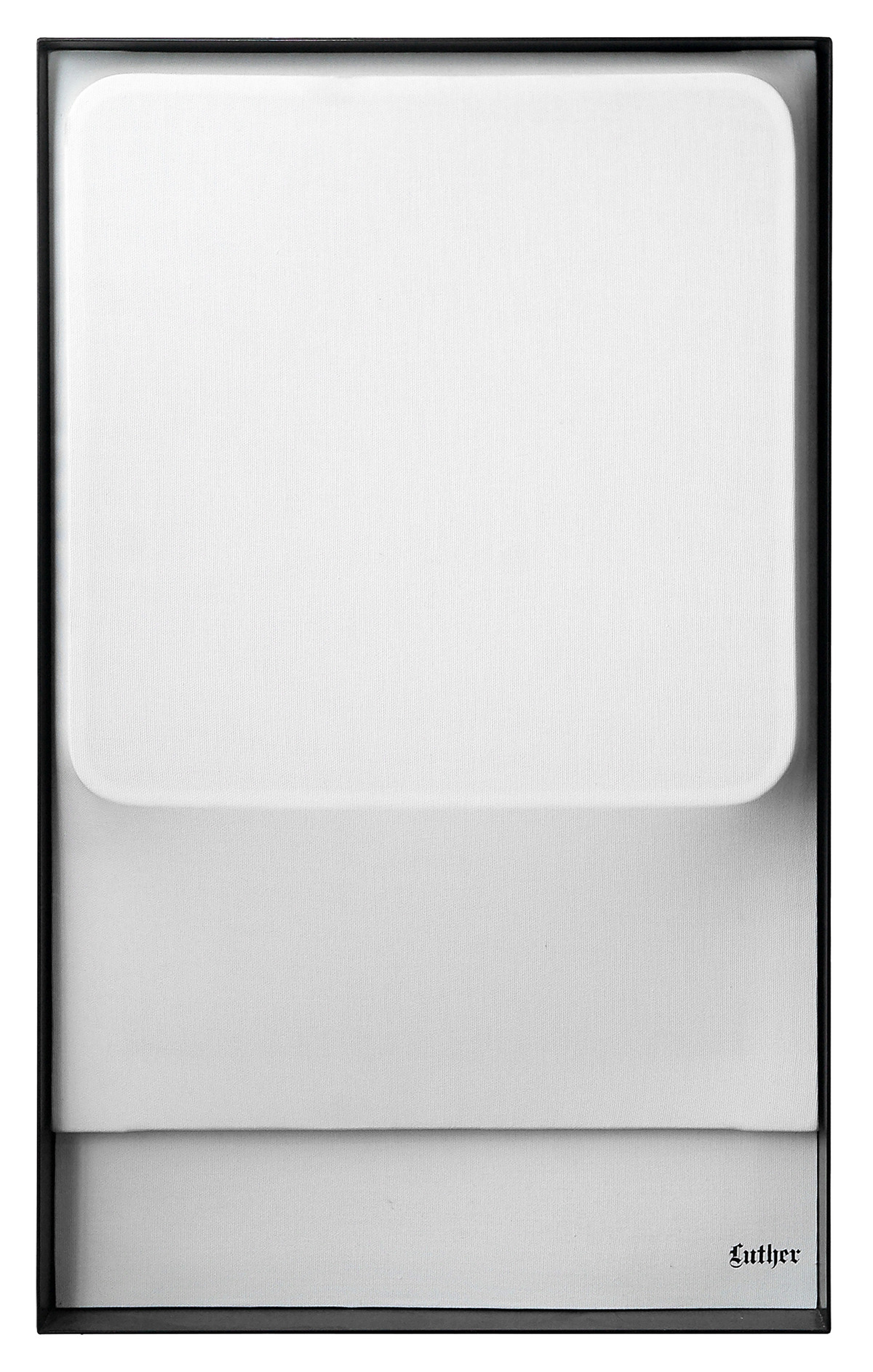 Schermo (Screen) on canvas with a ‘millerighe’ texture, inserted in a box frame with cardboard backing covered in the same fabric. The title of the artwork is displayed in the bottom-right-hand corner of the cardboard with Letraset transfer letters in German Gothic script. Luther is one of forty ‘thoughts’ that Mauri presented on forty screens at the ‘Warum ein Gedanke einen Raum verpestet?/Perché un pensiero intossica una stanza?’ exhibition-installation (inv. 700): words that were significant for various reasons, arranged in a scattered order, as if in a stream of consciousness.