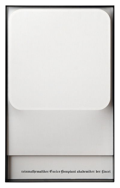 Schermo (Screen) on canvas with a ‘millerighe’ texture, inserted in a box frame with cardboard backing covered in the same fabric. The title of the artwork is displayed in the bottom-right-hand corner of the cardboard with Letraset transfer letters in German Gothic script. Reinmathematiker Enrico Bompiani Akademiker der Lincei is one of forty ‘thoughts’ that Mauri presented on forty screens at the ‘Warum ein Gedanke einen Raum verpestet?/Perché un pensiero intossica una stanza?’ exhibition-installation (inv. 700): words that were significant for various reasons, arranged in a scattered order, as if in a stream of consciousness.