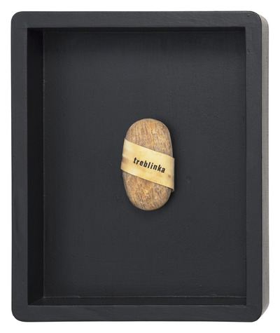 A bar of soap wrapped in a piece of paper with a stripy pattern, reminiscent of classic prisoner uniforms, exhibited in a painted wooden drawer. On the side, in transfer letters, we read the name ‘Treblinka’, the town in Upper Bavaria that became infamous for hosting a Nazi concentration camp. This work was part of the ‘Ebrea’ exhibition-installation (inv. 3476), rendering the dystopia of a Nazi-ruled world in which racialised bodies, reduced to mere organic matter, were commonly used to make furniture and objects.