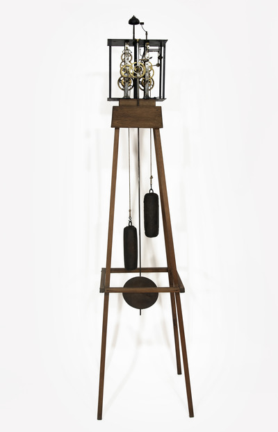 A manipulated pendulum clock, with its dial removed and mounted on a wooden stand, Senza tempo ticked at regular intervals, accompanied by chimes at seemingly random moments. ‘Without numbers, hands, or a dial, the work reveals the mechanism of a pendulum clock, an image of relatively Absolute Time, beyond hourly measurements. Without specifying which before, after, or even where, its cadence attests to a before and an after. The pendulum mechanically rings some of its own hours, not synchronous with Earth time, highlighting therefore an existing, disjointed time, absorbed in the succession of its own rhythm, heedless of history. Like Being. This work has no axiomatic pretentions; it is awe.’1