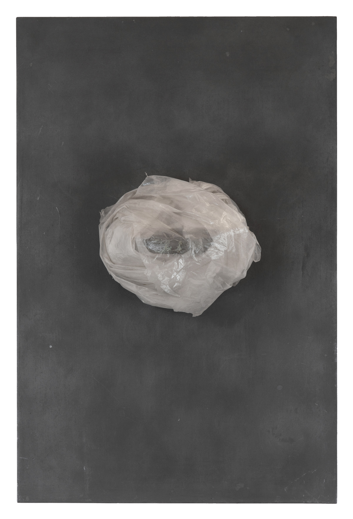 Nylon conceals a protruding element from a graphite-patinated iron plate, which the title suggests is a pressure gauge. This work was part of Mauri’s ‘Autobiografia come teoria’ exhibition- installation (inv. 2171), in which the artist presented compositions of objects associated with his personal history on panels of identical format and craftsmanship.