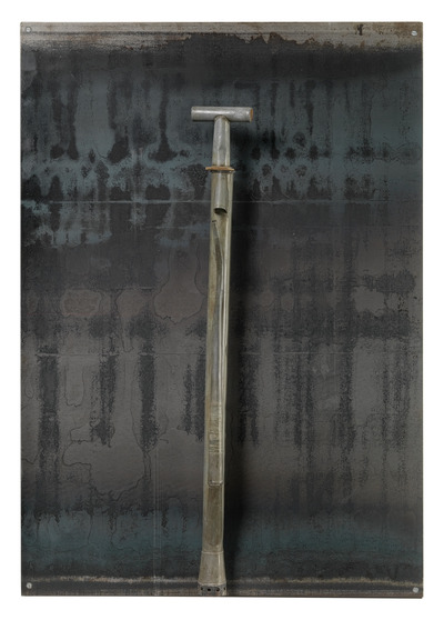 A sheet of black iron backs a metal hand pump. This work was part of the ‘Picnic o Il buon soldato’ exhibition-installation (inv. 3204).