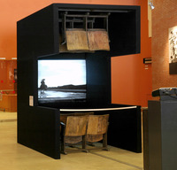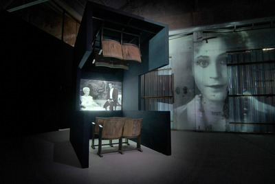 COMPONENTS: Iron, wood and canvas structure, 8 wooden cinema chairs, digital projector on base in iron and graphite