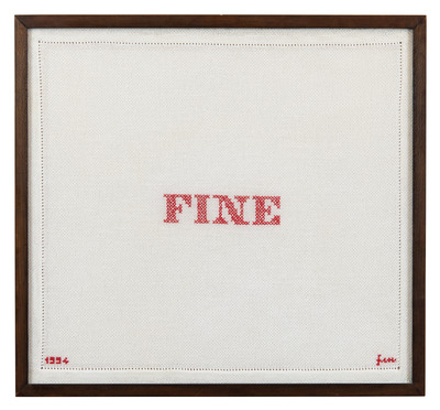 In 1994 and 1995, Mauri experimented with the technique of embroidery on several artworks, which the artist commissioned from his studio assistant Teresa Rinaldi, a skilled embroiderer who co-signed some of these works with him. This collaboration produced The End (inv. 732), Fine (inv. 733), and Corso di filosofia dell’estetica (inv. 422), as well as embroidery on various ‘Aryan objects’ in the ‘Arierwiege’ exhibition-installation (inv. 615, 620, 747, 925).